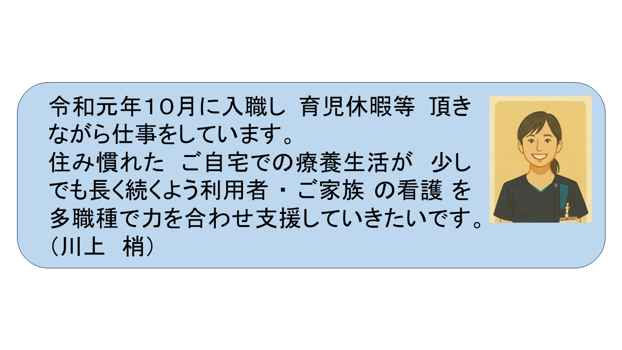 訪問看護とは、看護師がお宅に訪問して、その方の病気や障がいの応じた看護を行うことです。